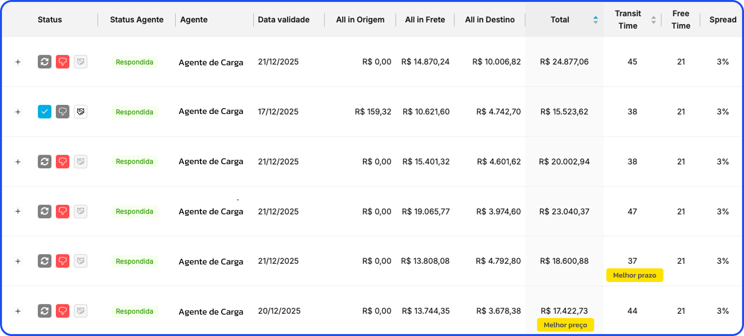 Compare agentes, custos e transit time com dados históricos e indicadores claros de decisão.